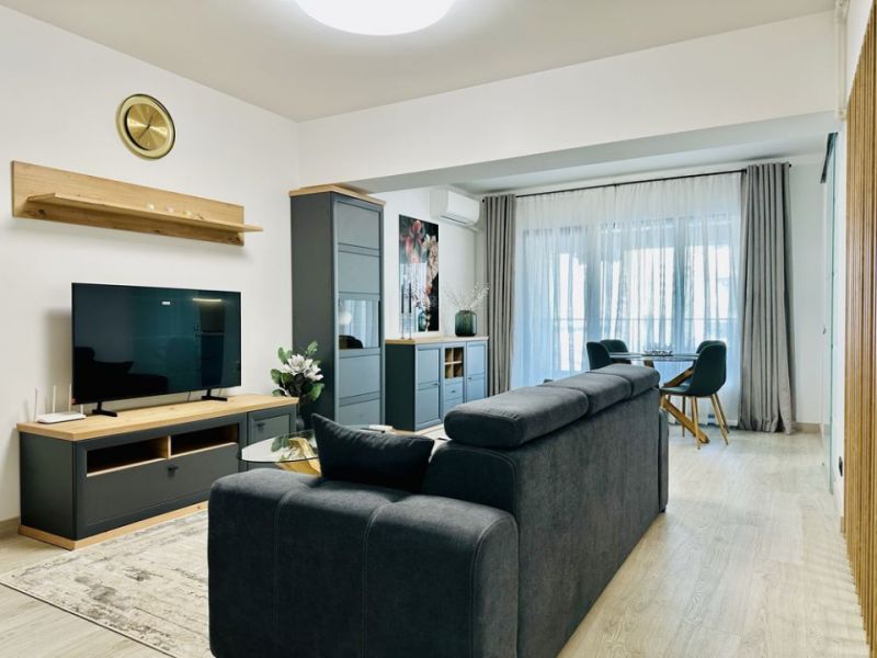 Dispune de un living luminos echipat cu o canapea extensibila, AC