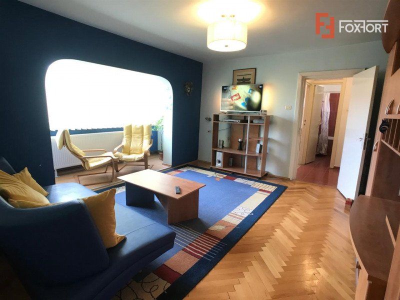 Foxfort Imobiliare propune spre inchiriere un apartament cu 2 camere, semidecomandat, aflat la etajul 3 intr-un bloc cu 4 etaje, structura beton, suprafata utila de 56 mp, fiind structurat astfel: hol, bucatarie, living, dormitor, baie cu geam, debara.