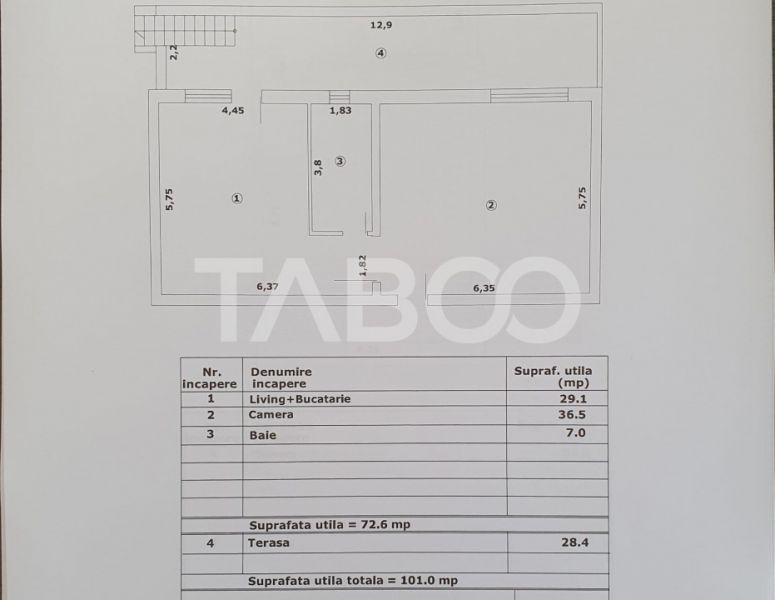 Suprafata utila de 73 mp + terasa de 28 mp.