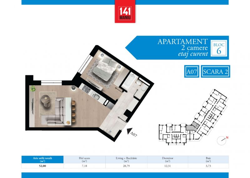 Apartament 2 camere, suprafata totala 52 mp, complet finisat, situat la 3 minute de statia de metrou Pacii.