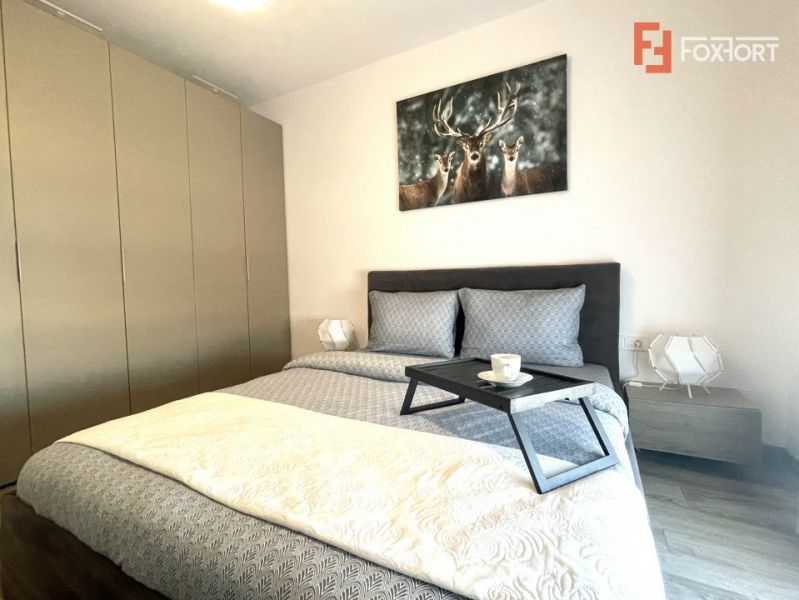 Apartamentul este complet mobilat si utilat: plita inductie, cuptor electric, hota, masina de spalat rufe, masina de spalat vase, frigider cu congelator, cuptor cu microunde, TV.