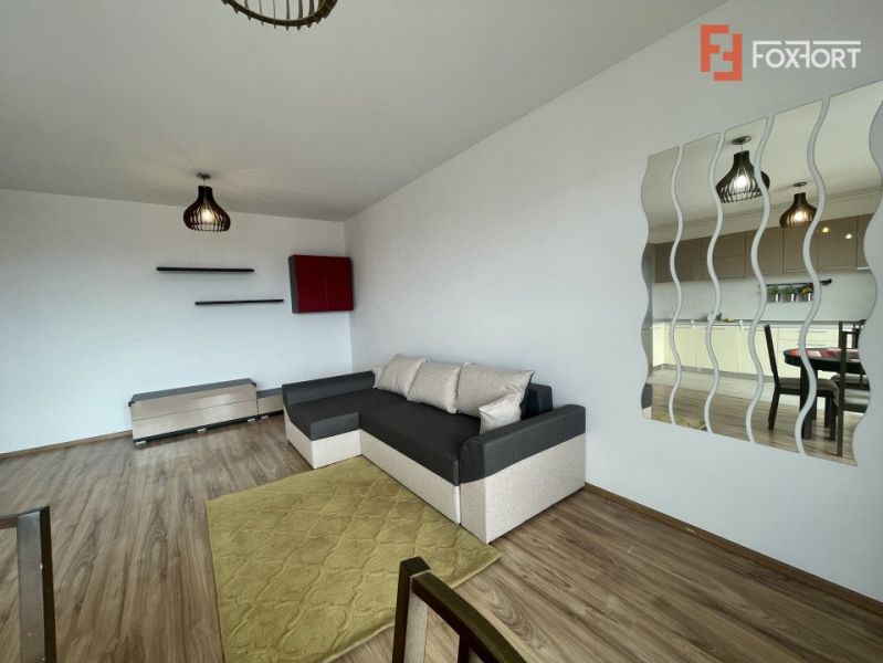 FOXFORT Imobiliare va propune spre inchiriere un apartament cu 2 camere, decomandat, situat in localitatea Timisoara, zona Aradului, aflat la etajul 6 intr-un bloc cu 9 Etaje. Anul constructiei 2017, structura beton, material zidarie caramida, izolatie. Suprafata utila de 54,83 mp + balcon de 7 mp. Apartamentul este structurat astfel: hol spatios, living cu bucatarie open space si balcon, dormitor, baie cu cada.