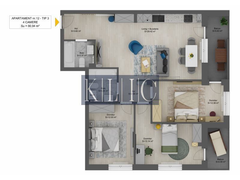Apartamentul include 3 dormitoare spațioase, un living open-space conectat cu bucătăria in suprafata de 29,42mp, 2 băi moderne și două balcoane perfecte pentru relaxare sau activități recreative.