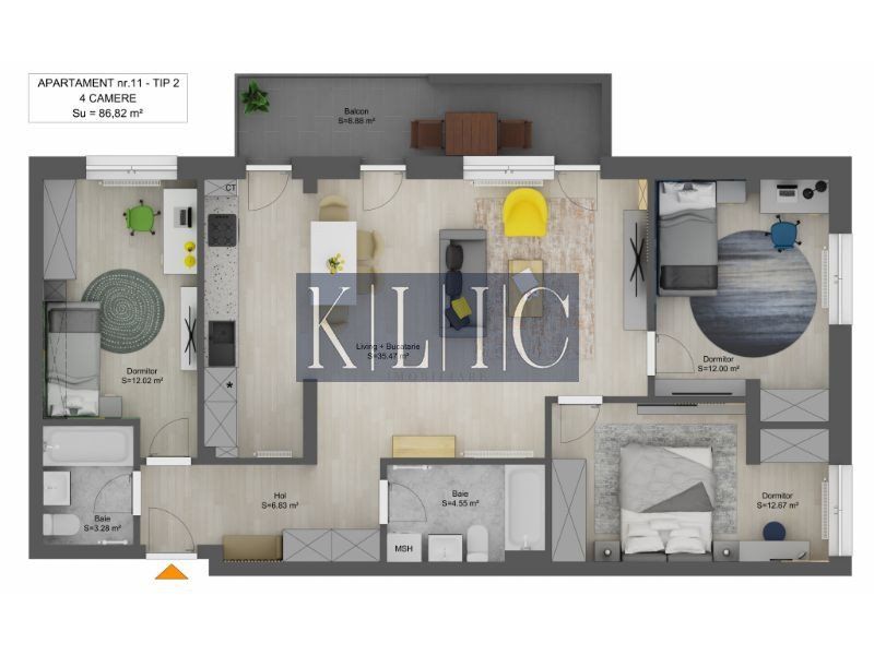 Apartamentul include 3 dormitoare spațioase, un living open-space conectat cu bucătăria in suprafata de 35,47mp, 2 băi moderne și două balcoane perfecte pentru relaxare sau activități recreative.