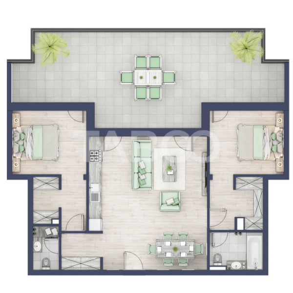 TABOO Imobiliare propune un apartament de vanzare cu 3 camere, decomandat, situat in localitatea Sibiu, zona Turnisor, aflat la etaj retras intr-un imobil tip bloc cu regim de inaltime pe Parter + 3 Etaje + Etaj Retras; anul constructiei 2025, structura caramida. Suprafata utila de 75 mp + terasa de 46 mp.
