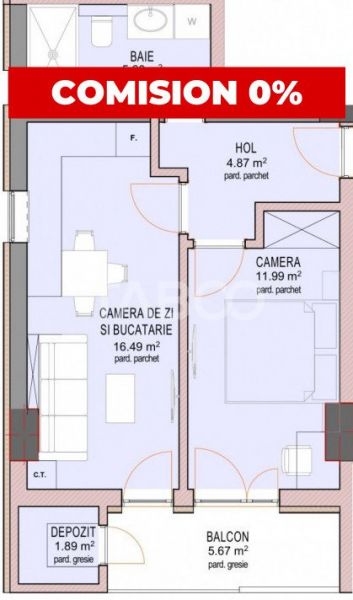 Locuinta este bine compartimentata si dispune de o suprafata utila de 41 mp dupa cum urmeaza: hol de 5 mp la intrare, livingul cu bucataria open-space de 16 mp cu iesire in balconul de 6 mp, spatiu de depozitare de 2 mp, dormitor matrimonial de 12 mp, baie de 6 mp cu geam de aerisire.