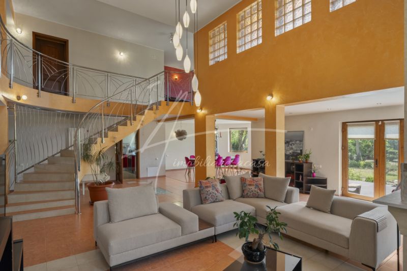 Scara interioara generoasa, curbata, conduce catre holul imens de la etaj cu vedere catre living si acces in terasa ce iti confera un peisaj placut ochiului, al zonei din spatele casei. Dormitoarele in numar de 5, fiecare cu baie proprie, sunt comandate de holul larg, de asemenea cu vedere catre living-ul parterului.