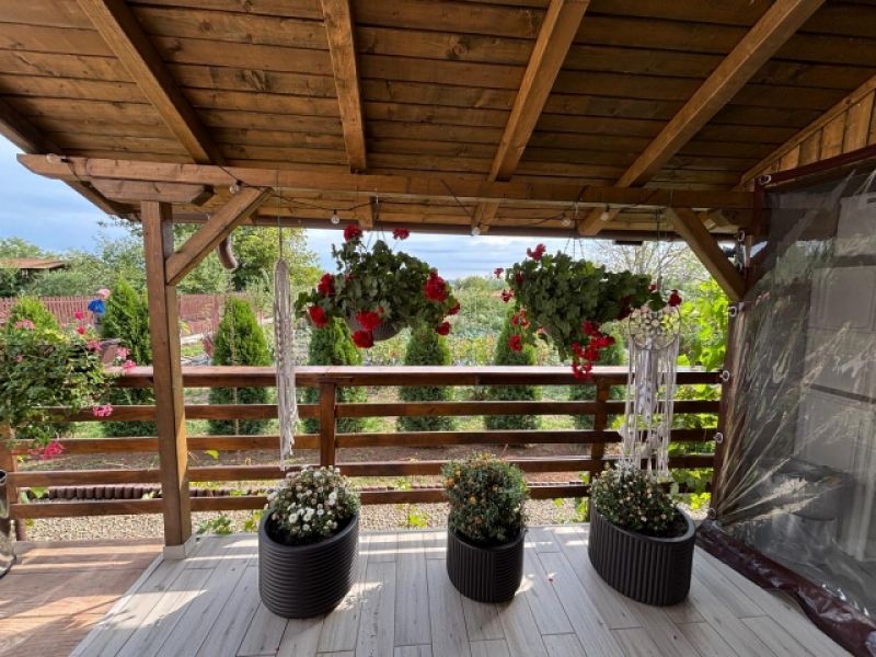 Foisor din lemn si caramida Brikston mobilat si utilat (plita ceaun,gratar,plita,cuptor pe lemne ,aragaz,frigider,balansoar,semineu pe gaz, chiuveta cu boiler electric,cismea, )inchis cu folie cristal si plase de tantari, suprafata50 mp.