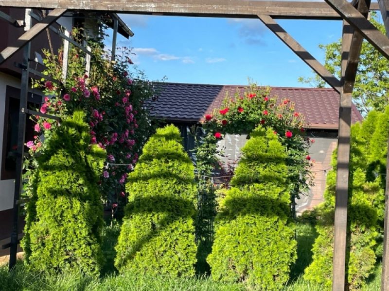 Suprafata totala de teren 1000 mp ,teren cultivat aproximativ 600 mp cu culturi de capsuni remontante,de zmeuri remontanti,diversi pomi fructiferi,trandafiri dulceata,coacazi , muri,solar 24 mp ,sisteme de irigare prin picatura,gradina cu pergola transafiri cataratori ,tuia ,artar japonez,tuia, iasomie.