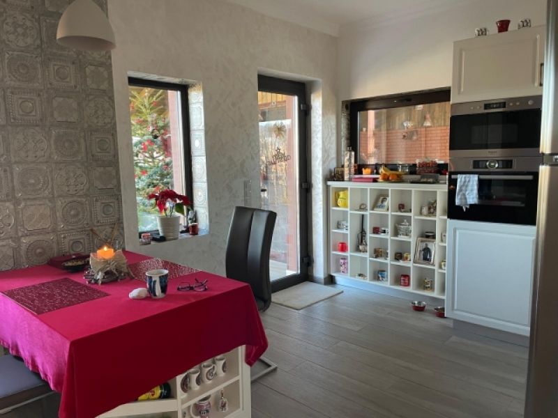 Dotari casa:centrala pe gaz BAXI ,incalzire pardoseala parter , geamuri tripan fourseason,mocheta ,parchet Tarkett ,gresie,faianta , usi Porta Doors ,3 unitati de AC de 12btu , termoizolatie exterioara 20 cm parter respectiv 40 cm etaj , pod izolat termic ( acoperiș si tavan etaj ).Mobila este achizionata de la Mobexpert si personalizata, electrocasnice Hotpoint, Bosch .