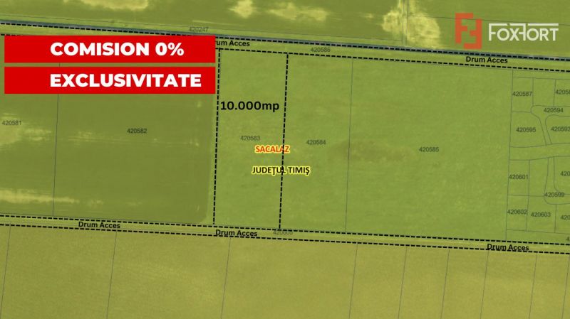 FOXFORT propune teren extravilan pretabil agricol de vanzare in Sacalaz, zona Exterior Vest, avand o suprafata de 10.000 mp, numar fronturi 2 si deschiderea de 120 ml la drum de pamant.