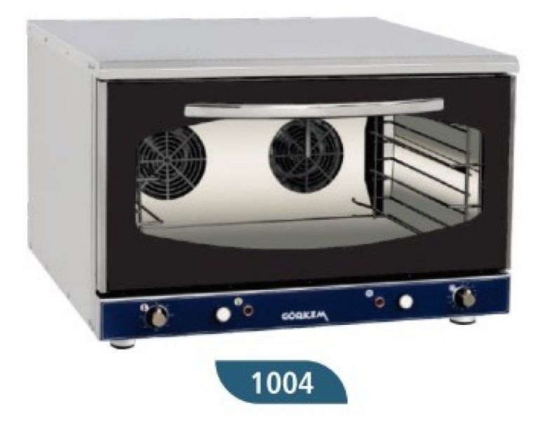 1004- Cuptor convectie pentru gastronomie/patiserie cu 4 tavi; putere 6.4 KW; Control mecanic, prevazut cu timer: 0÷120 minute; temperatura de lucru 0÷300ºC; alimentare 220V/380V; lumina interna; Greutate 64 kg 800x790x570 mm