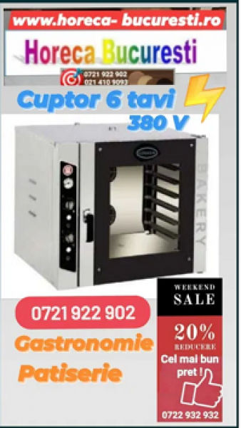 1006-Cuptor convectie pentru gastronomie/patiserie cu 6 tavi; putere 6.4 KW; Control mecanic, prevazut cu timer: 0÷120 minute; temperatura de lucru 0÷300°C; alimentare 220V/380V; lumina interna; Greutate 105 kg- 970x840x900 mm - Pret- 10146 lei+tva /discount de 7%- 9436 lei+tva