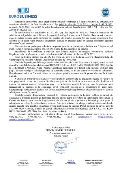 Subscrisa Euro Business LRJ, in calitate de lichidator judiciar, vinde prin licitatie publica: Proprietate imobiliară cu destinație rezidențială, situată în Mun. Piatra Neamț, Str. Bistriței nr. 55, Jud. Neamț, compusă din teren și construcții, astfel: Teren intravilan, situat în Mun. Piatra Neamț, Str. Bistriței nr. 55, Jud. Neamț, în suprafață totală de 458,00 mp din acte, respectiv 405,50 mp măsurată, categoria de folosință curți - construcții, având nr. cad. 54413 (nr. cad. vechi: 2076), înscris în CF 54413 (nr. CF vechi: 7833/N), a UAT Piatra - Neamț și Construcția C1, cu destinație construcție administrativă și social culturală, cu regim de înălțime P, cu nr. cad. 54413 – C1, înscrisă în CF nr. 54413 (nr. CF vechi: 7833/N), a UAT Piatra-Neamț, având Sc la sol = 111,00 mp, Sc = 110,50 mp, Su = 87,25 mp, compusă din trei încăperi, două holuri, grup sanitar și casierie. Asupra activului imobil mai sus menţionat este instituit un sechestru penal asigurător, în virtutea Ordonanței nr. 95D/P/2021, din 25/11/2022, emisă de Parchetul de pe Lângă Înalta Curte de Casație și Justiție D.I.I.C.O.T. Biroul Teritorial Neamț. Relatii pe www.lrj.ro, in publicatia de vanzare sau telefonic de luni pana vineri intre orele 10:00 - 16:00.