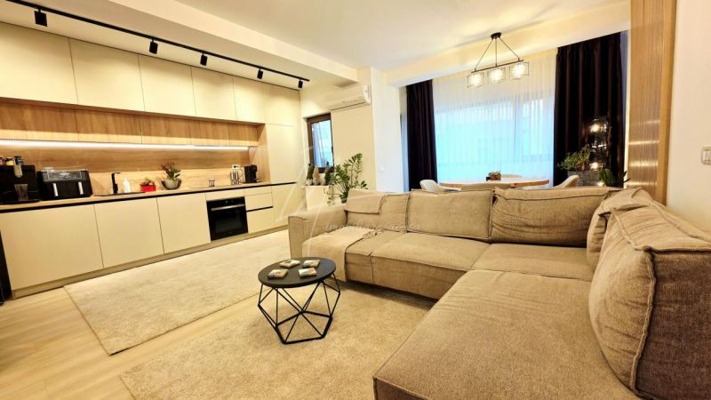 Bucataria deschisa cu livingul este mobilata si utilata cu tot ce este necesar. Livingul este minimalist si ultramodern si, odata cu canapeaua extensibila aflata in fata comodei TV, vine la "pachet" si cu o zona de "dressing" suficient de incapatoare pentru cerinta de spatiu pentru haine.