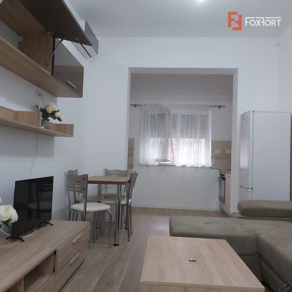 FOXFORT Imobiliare propune spre inchiriere un apartament cu 2 camere, open space, situat in zona de Sud a Dumbravitei, aflat la parterul unui bloc cu 2 etaje, an constructie 2020, structura beton, suprafata utila de 47 mp, fiind structurat astfel: