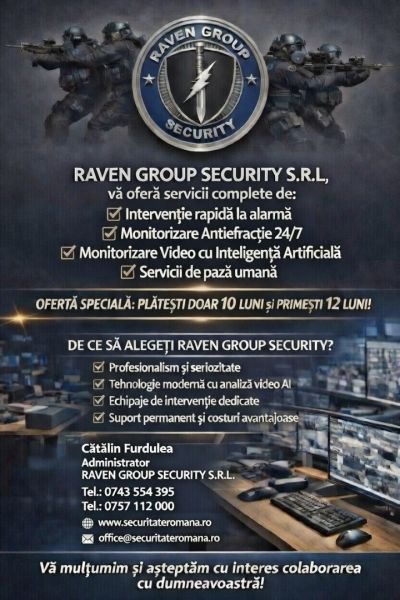 Societatea RAVEN GROUP SECURITY S.R.L, este avizată să execute servicii de intervenție, mentenanță, monitorizare antiefracție și monitorizare video cu inteligență artificială în Dispeceratul din Constanța.