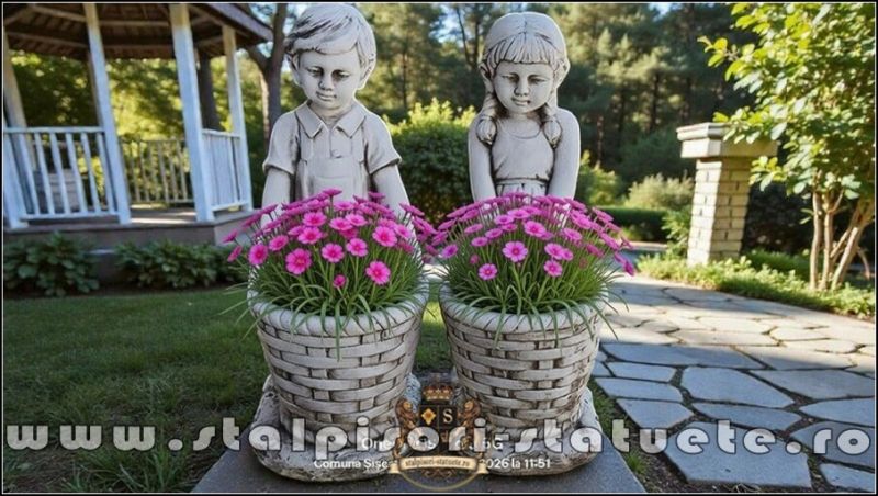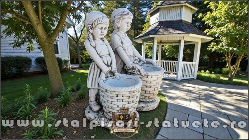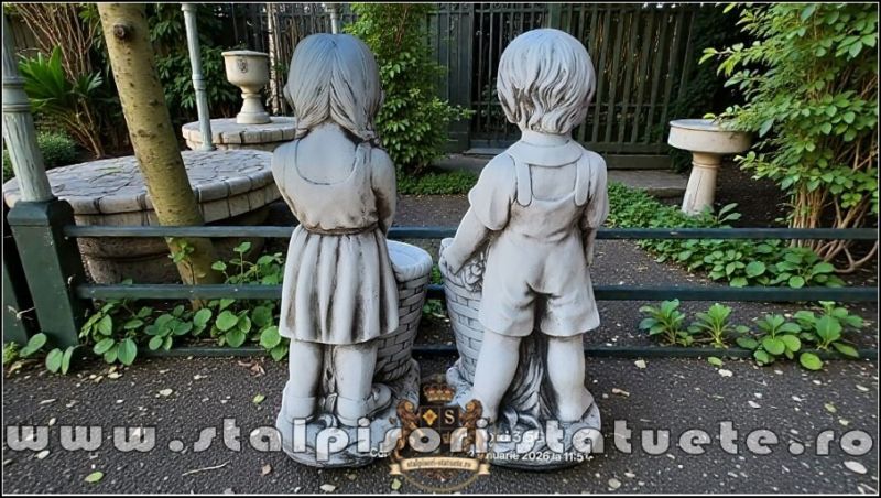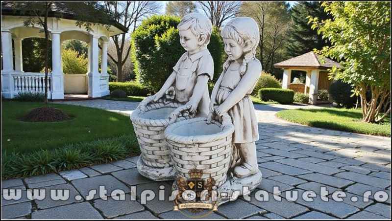 Statuete copii cu coșulețe, gri antichizat, model J9.