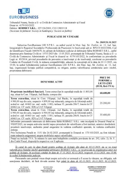 Subscrisa Euro Business LRJ, in calitate de lichidator judiciar, vinde prin licitatie publica: Proprietate imobiliară funciară, Teren extravilan în suprafață totală de 11.803,00 mp, situat în Com. Filipești, Jud Bacău, compus din:Teren extravilan, situat în Com. Filipești, Jud Bacău, în suprafață totală de 4.900,00 mp din acte, respectiv 4.899,00 mp măsurată, categoria de folosință arabil, având nr. cad. 60462 (nr. cad. vechi: 1180), tarlaua 35, parcela 286/7, înscris în CF 60462 (nr. CF vechi: 828) a UAT Filipești și Teren extravilan, situat în Com. Filipești, Jud Bacău, în suprafață totală de 6.900,00 mp din acte, respectiv 6.904,00 mp măsurată, categoria de folosință arabil, având nr. cad. 60463 (nr. cad. vechi: 1181), tarlaua 35, parcela 286/8, înscris în CF 60463 (nr. CF vechi: 829) a UAT Filipești. Relatii pe www.lrj.ro, in publicatia de vanzare sau telefonic de luni pana vineri intre orele 10:00 - 16:00.