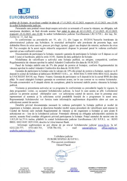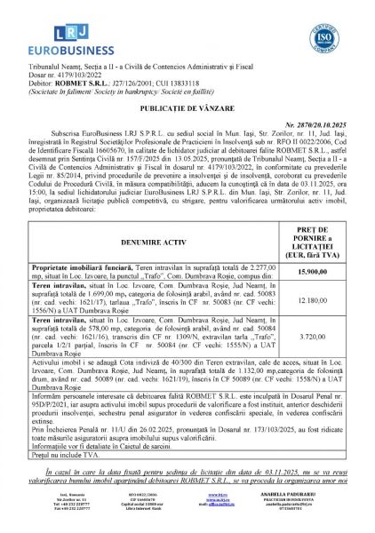 Subscrisa Euro Business LRJ, in calitate de lichidator judiciar, vinde prin licitatie publica: PProprietate imobiliară funciară, Teren intravilan în suprafață totală de 2.277,00 mp, situat în Loc. Izvoare, la punctul ,,Trafo”, Com. Dumbrava Roșie, compus din: Teren intravilan, situat în Loc. Izvoare, Com. Dumbrava Roșie, Jud Neamț, în suprafață totală de 1.699,00 mp, categoria de folosință arabil, având nr. cad. 50083 (nr. cad. vechi: 1621/17), tarlaua ,,Trafo”, înscris în CF nr. 50083 (nr. CF vechi: 1556/N) a UAT Dumbrava Roșie și Teren intravilan, situat în Loc. Izvoare, Com. Dumbrava Roșie, Jud Neamț, în suprafață totală de 578,00 mp, categoria de folosință arabil, având nr. cad. 50084 (nr. cad. vechi: 1621/16), transcris din CF nr. 1309/N, extravilan tarla ,,Trafo”, parcela 1/2/1 parțial, înscris în CF nr. 50084 (nr. CF vechi: 1555/N) a UAT Dumbrava Roșie. Activului imobil i se adaugă Cota indiviză de 40/300 din Teren extravilan, cale de acces, situat în Loc. Izvoare, Com. Dumbrava Roșie, Jud Neamț, în suprafață totală de 1.132,00 mp,categoria de folosință drum, având nr. cad. 50089 (nr. cad. vechi: 1621/19), înscris în CF 50089 (nr. CF vechi: 1558/N) a UAT Dumbrava Roșie. Informăm persoanele interesate că debitoarea falită ROBMET S.R.L. este inculpată în Dosarul Penal nr. 95D/P/2021, iar asupra activului imobil supus procedurii de valorificare a fost instituit, anterior deschiderii proedurii insolvenței, sechestru penal asigurator în vederea confiscării speciale, în vederea confiscării extinse. Prin Încheierea Penală nr. 11/U din 26.02.2025, pronunțată în Dosarul nr. 173/103/2025, au fost ridicate toate măsurile asiguratorii asupra imobilului supus valorificării. Informațiile vor fi detaliate în Caietul de sarcini. Relatii pe www.lrj.ro, in publicatia de vanzare sau telefonic de luni pana vineri intre orele 10:00 - 16:00.
