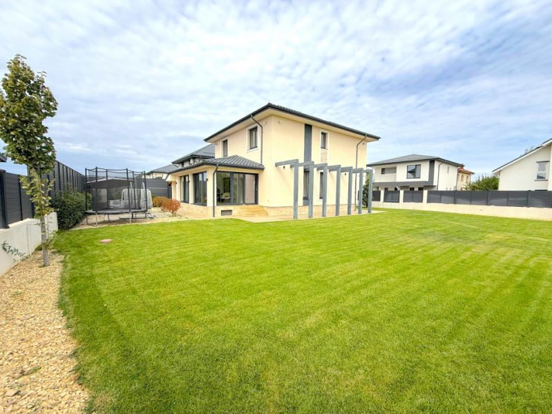 Vă propunem spre vânzare o vilă cu design deosebit, finalizată și pregătită pentru mutare imediată, complet mobilată cu mobilier pe comandă cu fronturi din MDF și utilată cu electrocasnice moderne. Proprietatea dispune de 5 camere, 3 băi, o terasă închisă și încălzită, cameră tehnică și finisaje premium.